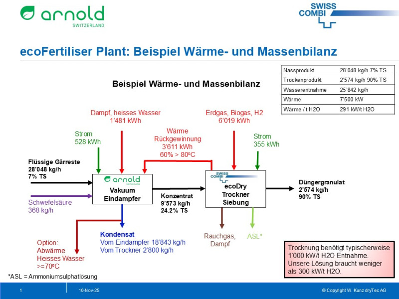 Übrigens, das heisse Wasser, das beim Eindampfen entsteht, könnte ebenfalls noch verwendet werden, bspw. um Gärtanks oder Gebäude zu heizen – oder für einen Bandtrockner, der dann auch noch die festen Gärreste trocknet.