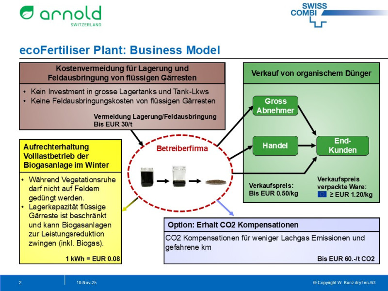 Gerade bei grossen Mengen an flüssigen Gärresten lohnt es sich, ihnen nicht nur einen Teil des Wassers zu entziehen, sondern sie tatsächlich zu trocknen. SWISS COMBI hat gemeinsam mit Arnold + Partner ein Verfahren entwickelt, um flüssige Gärreste zu einem streu- und lagerfähigen, organischen Düngergranulat zu verarbeiten.
