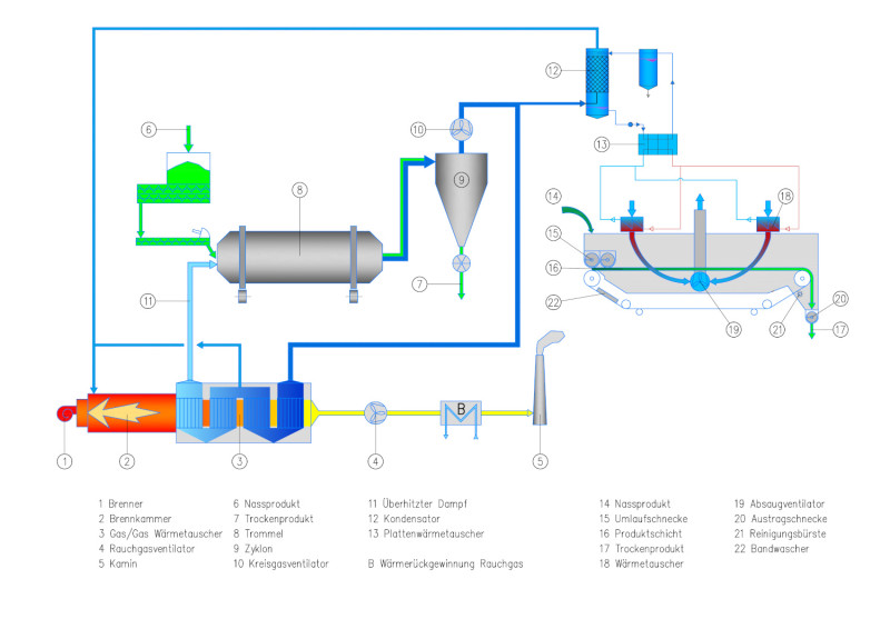 In der Regel ist beim ecoTwin der Bandtrockner der Vortrockner und der ecoDry der Endtrockner. Je nach Produkt ist aber auch eine umgekehrte Reihenfolge möglich. Dann wird das nasse Produkt zunächst mit überhitztem Dampf im ecoDry Trommeltrockner vorgetrocknet. Die Endtrocknung erfolgt besonders schonend als Lufttrocknung im Bandtrockner.