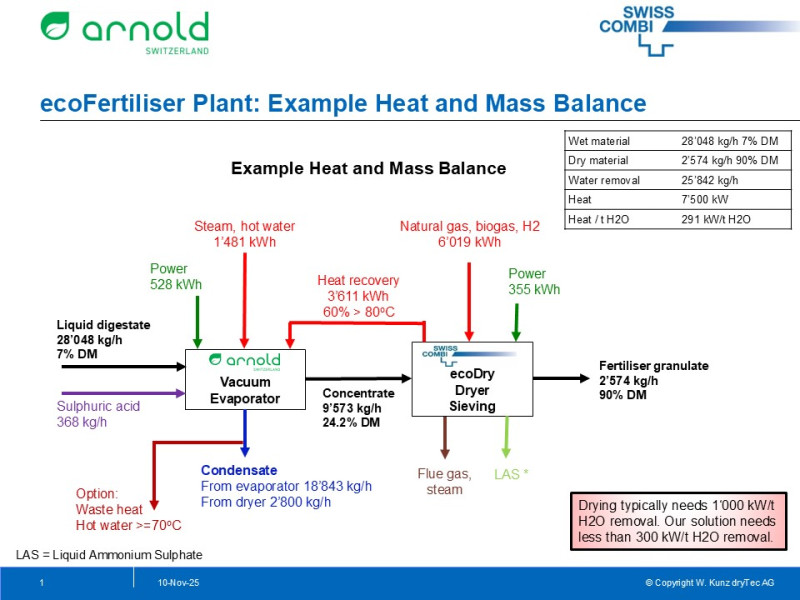 In the eFP, around 28 tonnes of liquid digestate are processed into almost 2.6 tonnes of fertiliser granules per hour. And with a heat demand of less than 300 kW per tonne of water removed, our solution is significantly more efficient than conventional drying methods, which require more than three times as much heat for water evaporation.